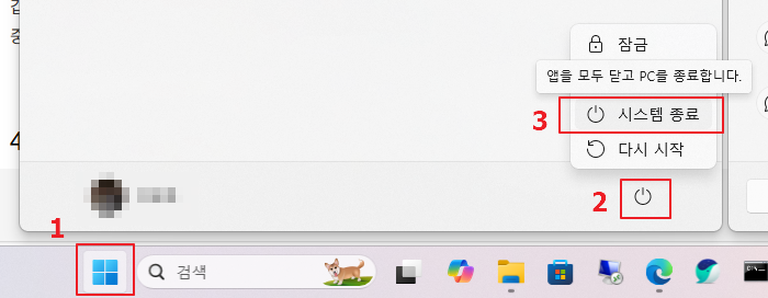 ▶ 시작 버튼 → 전원 → ‘종료’ 또는 ‘다시 시작’ 선택